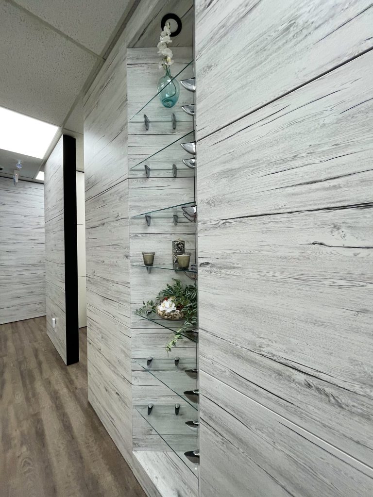 Knopov Design Group also created custom built-in shelving systems throughout the salon, to showcase various products and tools in a beautiful setting.