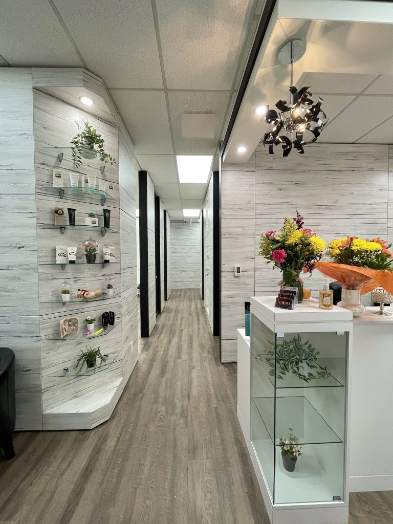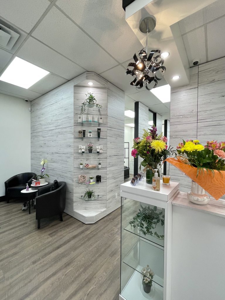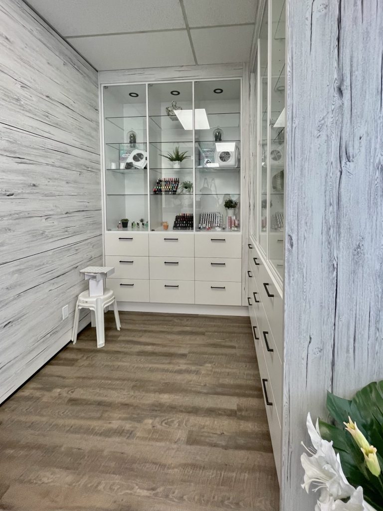 This beautifully designed salon optimizes the use of interior space, including reception and display areas, nail technician work spaces, training classroom, waxing station, massage room and break room.