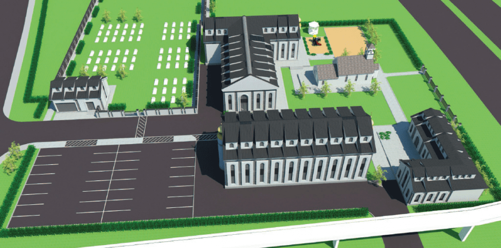 The completed design consists of a complex of four buildings and parking structures totalling 80,000 sq. ft. on a 0.9 acre site with extensive parking capacity, a columbarium, an outdoor plaza, patios, and treed walkways.